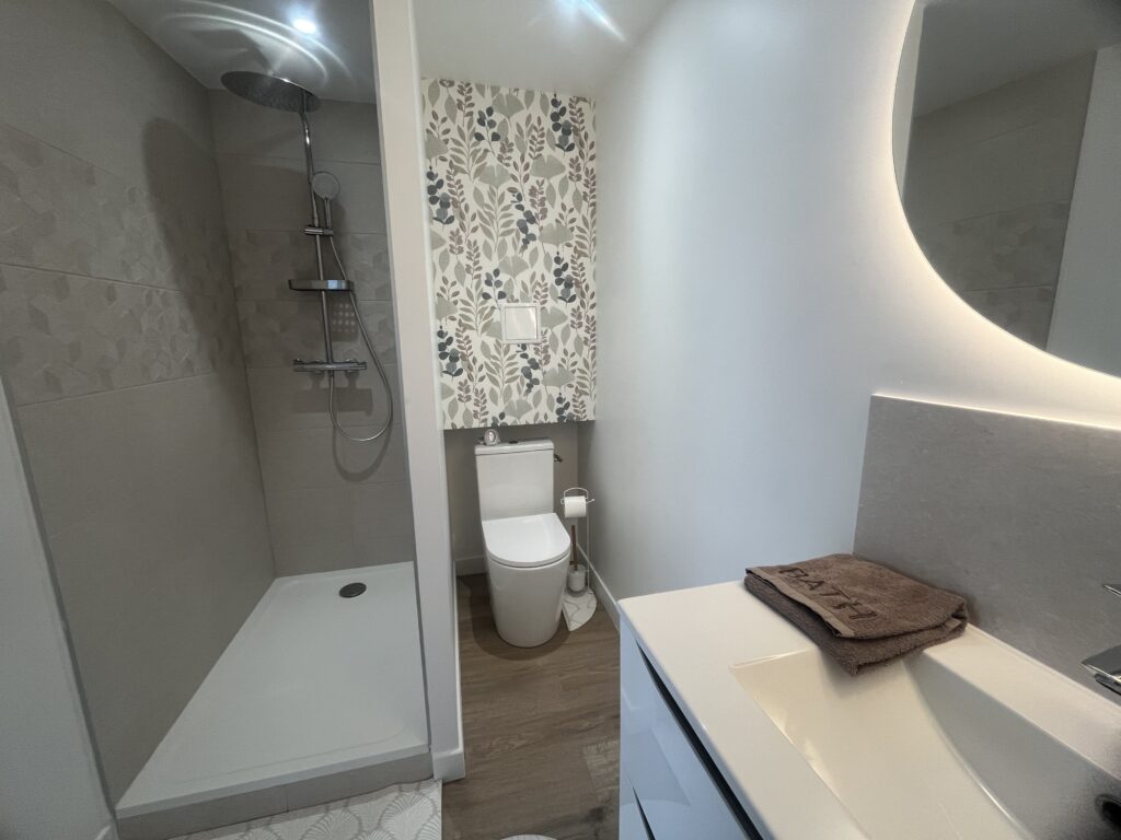Douche 120×80, WC, Lavabo, Sèche-serviette, sèche-cheveux